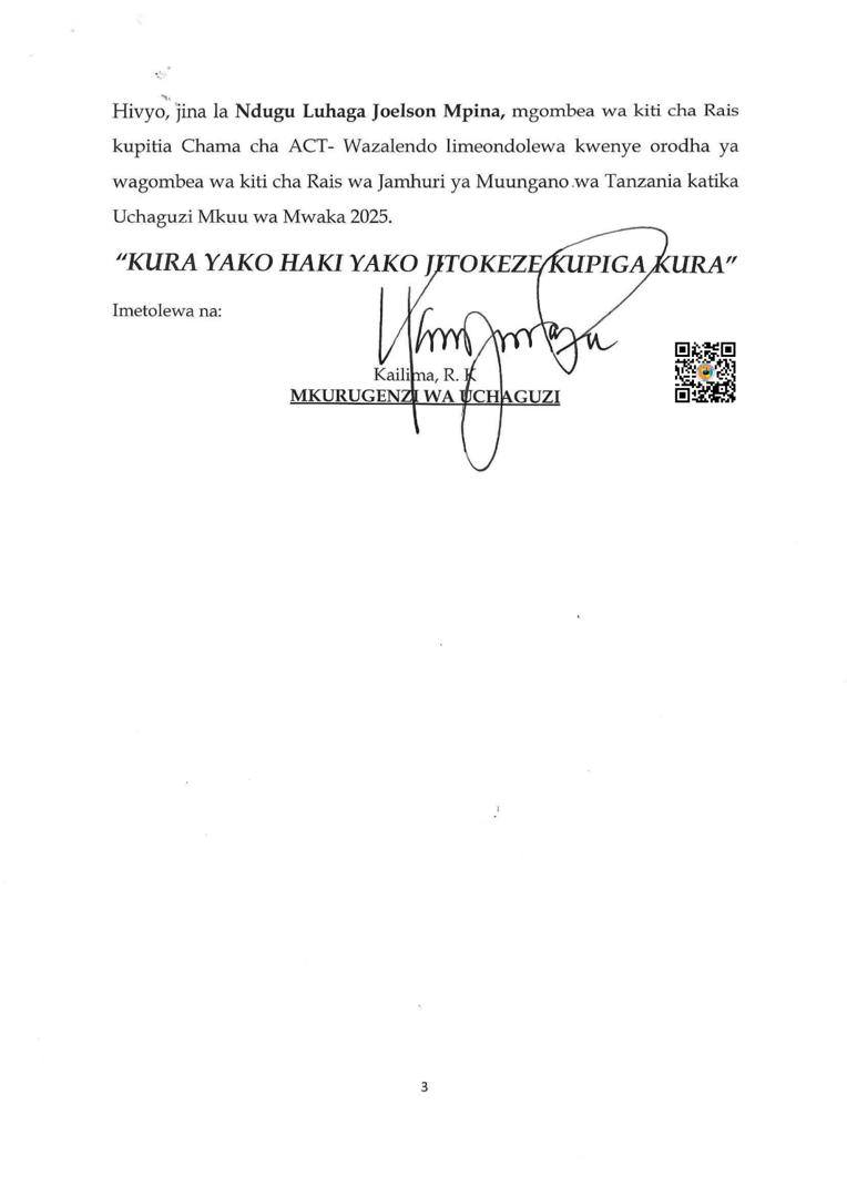 Hivyo, jina la Luhaga Mpina, mgombea wa kiti cha Rais kupitia Chama cha ACT Wazalendo limeondolewa kwenye orodha ya wagombea wa kiti cha Rais wa Jamhuri ya Muungano wa Tanzania katika Uchaguzi Mkuu wa Mwaka 2025.”