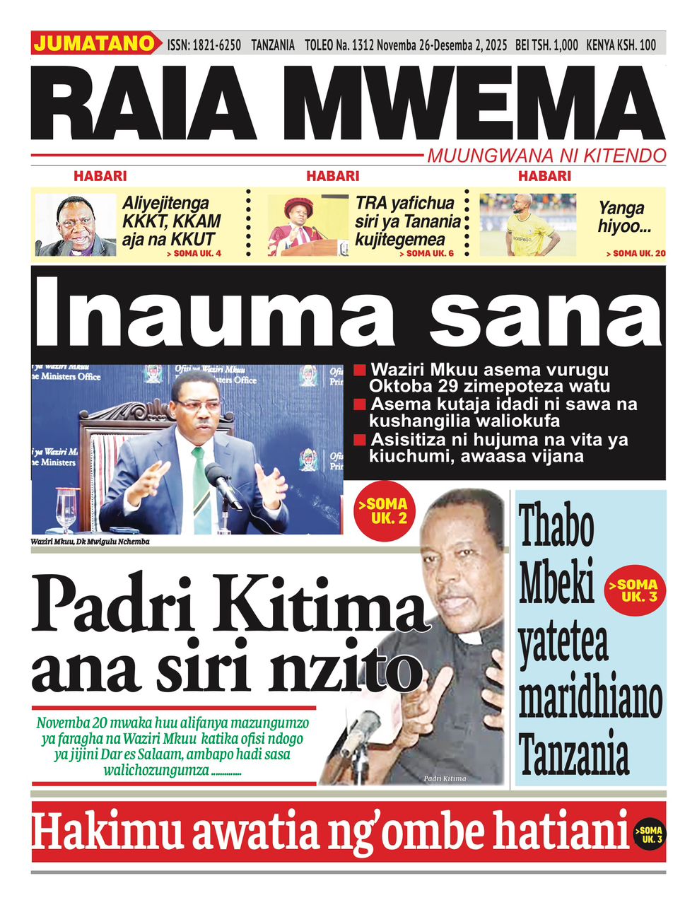 MAGAZETI ya Leo Jumanne 02 December 2025 Katibu Mkuu wa Baraza la Maaskofu Katoliki Tanzania (TEC), Padre Dkt. Charles Kitima, amesema kuwa miongoni mwa mambo yanayowasikitisha Watanzania kwa sasa ni kutokiri ukweli kwamba waliouawa wameuawa na nani, huku akihoji kwamba ilikuwaje vyombo vya usalama havikufanikiwa kuzuia mauaji yaliyojitokeza. MATANGAZO YA KAZI BOFYA HAPA Akizungumza na […]